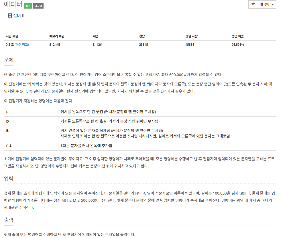 첫째 줄에는 초기에 편집기에 입력되어 있는 문자열이 주어진다. 이 문자열은 길이가 N이고, 영어 소문자로만 이루어져 있으며, 길이는 100,000을 넘지 않는다. 둘째 줄에는 입력할 명령어의 개수