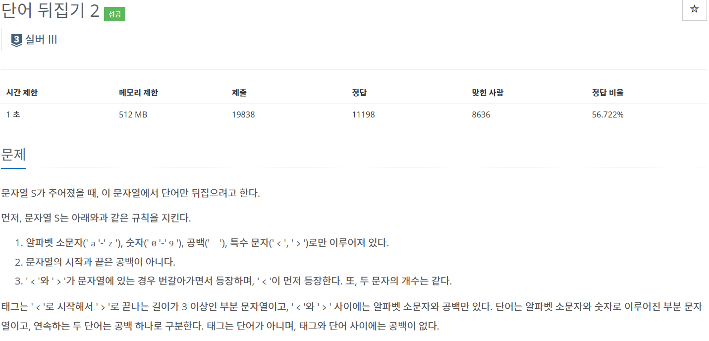 문자열 S가 주어졌을 때, 이 문자열에서 단어만 뒤집으려고 한다. 먼저, 문자열 S는 아래와과 같은 규칙을 지킨다. 알파벳 소문자('a'-'z'), 숫자('0'-'9'), 공백(' '), 특수 문자('<', '>')로만 이루어져