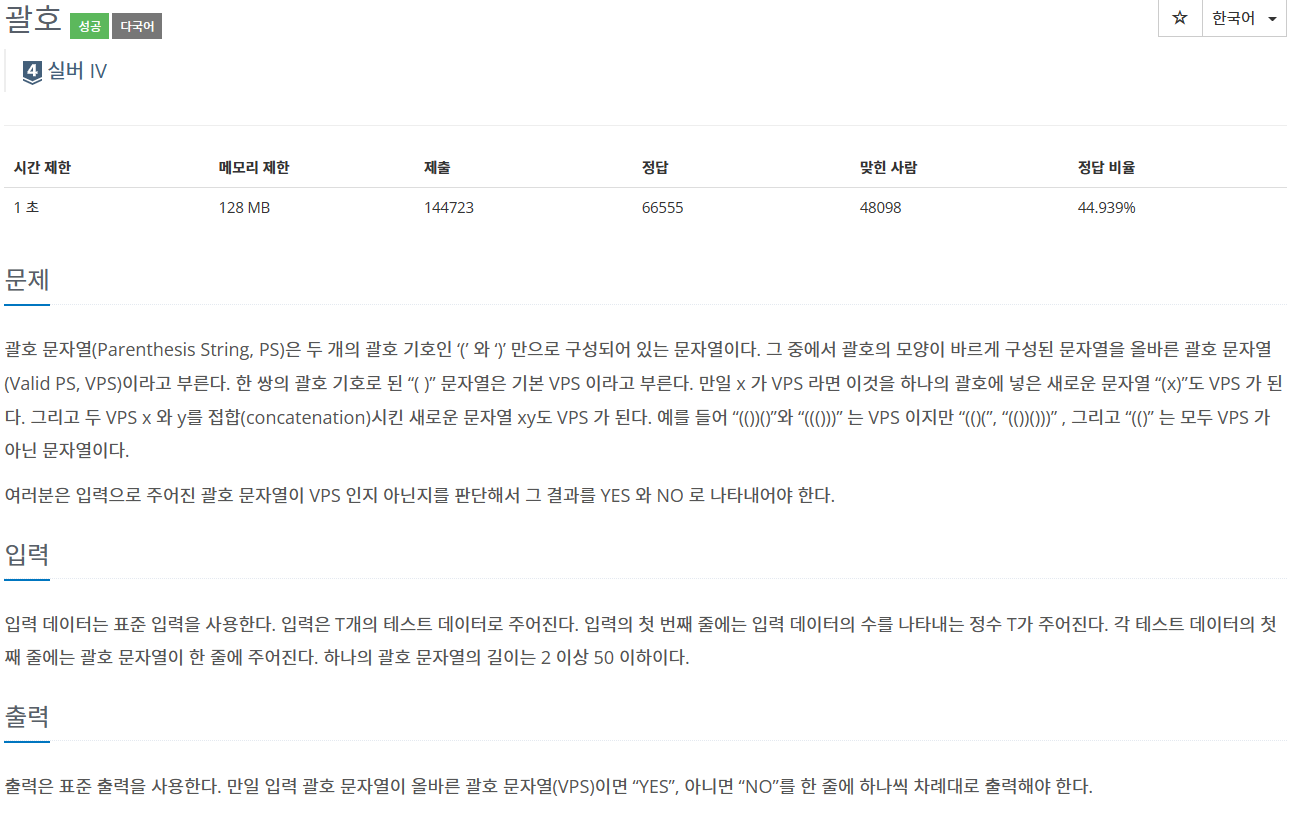 괄호 문자열(Parenthesis String, PS)은 두 개의 괄호 기호인 ‘(’ 와 ‘)’ 만으로 구성되어 있는 문자열이다. 그 중에서 괄호의 모양이 바르게 구성된 문자열을 올바른 괄호 문자열(Valid PS, VPS)이라고