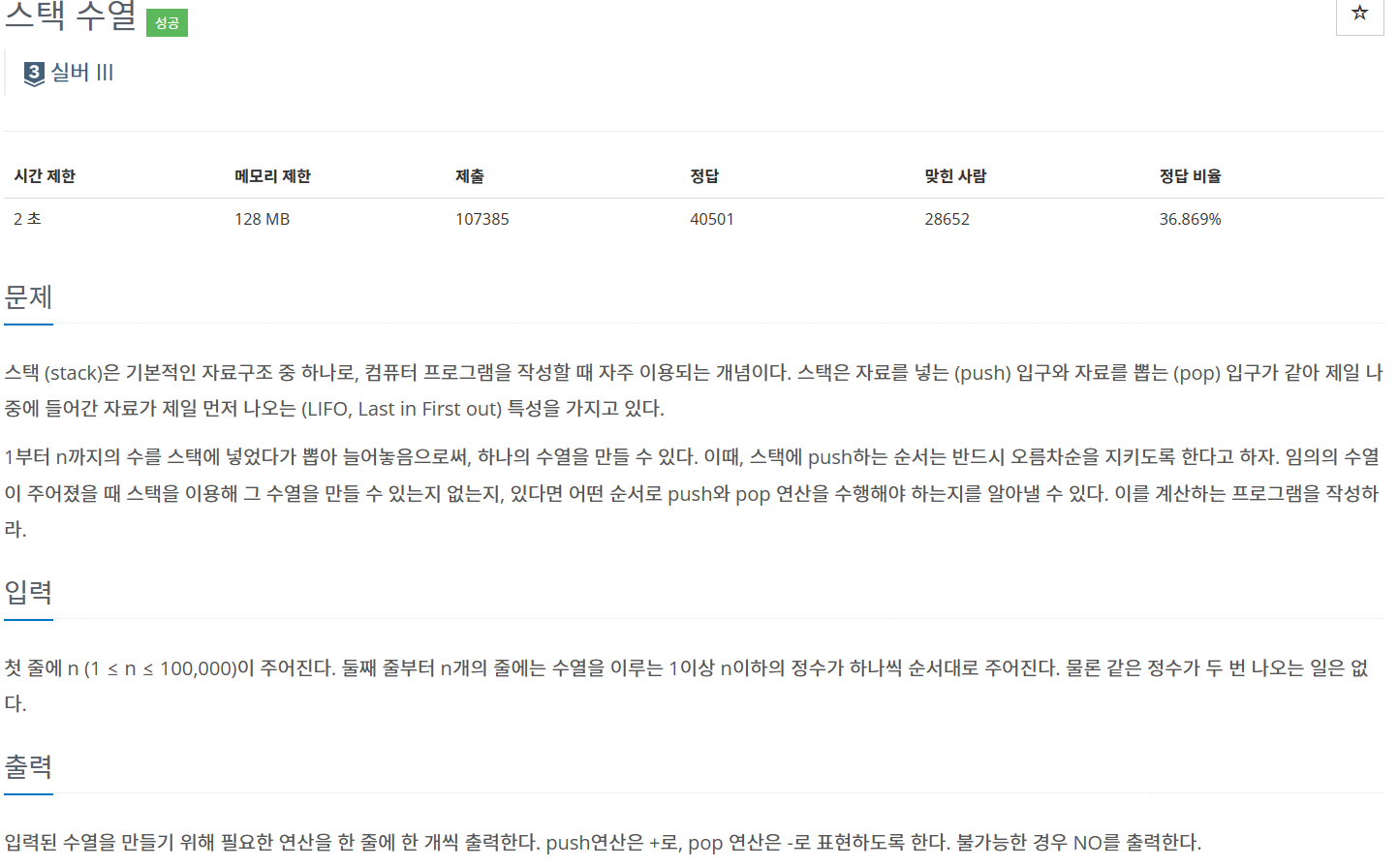 1부터 n까지에 수에 대해 차례로 [push, push, push, push, pop, pop, push, push, pop, push, push, pop, pop, pop, pop, pop] 연산을 수행하면 수열 [4, 3, 6, 8, 7, 5, 2, 1]을 얻을 수 있다.